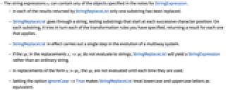 - StringReplaceList goes through a string, testing substrings that start at each successive character position. On each substring, it tries in turn each of the transformation rules you have specified, returning a result for each one that applies.