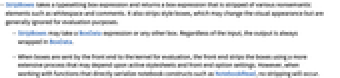 - StripBoxes takes a typesetting box expression and returns a box expression that is stripped of various nonsemantic elements such as whitespace and comments. It also strips style boxes, which may change the visual appearance but are generally ignored for evaluation purposes.