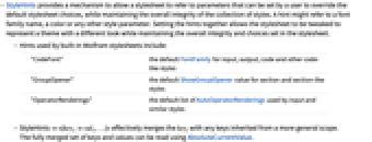 "CodeFont" the default FontFamily for input, output, code and other code‐like styles "GroupOpener" the default ShowGroupOpener value for section and section‐like styles "OperatorRenderings" the default list of AutoOperatorRenderings used by input and similar styles - StyleHints<|key1val1,…|> effectively merges the keyi with any keys inherited from a more general scope. The fully merged set of keys and values can be read using AbsoluteCurrentValue.