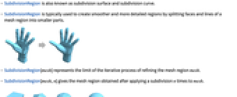 - SubdivisionRegion[mesh,n] gives the mesh region obtained after applying a subdivision n times to mesh.
