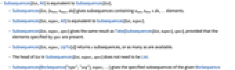 - Subsequences[list,nspec,spec] gives the same result as Take[Subsequences[list,nspec],spec], provided that the elements specified by spec are present.