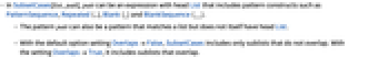 - In SubsetCases[list,patt], patt can be an expression with head List that includes pattern constructs such as PatternSequence, Repeated (..), Blank (_) and BlankSequence (__).