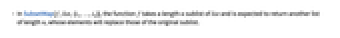 - In SubsetMap[f,list,{i1,…,in}], the function f takes a length-n sublist of list and is expected to return another list of length n, whose elements will replace those of the original sublist.