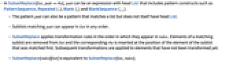 - In SubsetReplace[list,pattrhs], patt can be an expression with head List that includes pattern constructs such as PatternSequence, Repeated (..), Blank (_) and BlankSequence (__).