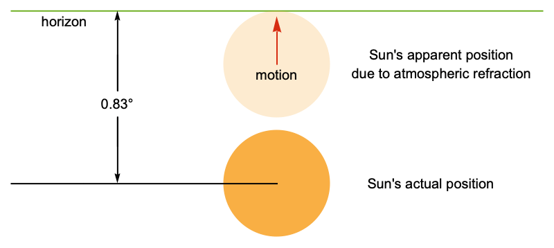 Eliminating atmospheric refraction effects, the true position of the Sun is revealed to be even further below the horizon at sunrise: