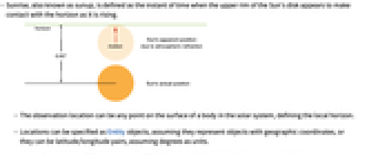 Automatic upper limb of the Sun crosses zero altitude alt center of the Sun crosses numeric altitude alt {alt,limb} the given limb of the Sun crosses numeric altitude alt - The reference altitude angle alt can be given as a Quantity angle or as a numeric expression interpreted in angular degrees. These are the traditional values of reference altitude: