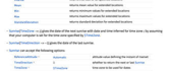 Automatic returns intervals for extended locations only Interval returns intervals for all specified locations Mean returns mean value for extended locations Min returns minimum values for extended locations Max returns maximum values for extended locations StandardDeviation returns standard deviation for extended locations - Sunrise[TimeZone->z] gives the date of the next sunrise with date and time inferred for time zone z by assuming that your computer is set for the time zone specified by $TimeZone.