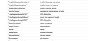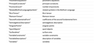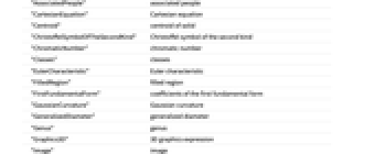 "AlgebraicDegree" algebraic degree "AlgebraicEquation" algebraic equation "AlternateNames" alternate names "AssociatedPeople" associated people "CartesianEquation" Cartesian equation "Centroid" centroid of solid "ChristoffelSymbolOfTheSecondKind" Christoffel symbol of the second kind "ChromaticNumber" chromatic number "Classes" classes "EulerCharacteristic" Euler characteristic "FilledRegion" filled region "FirstFundamentalForm" coefficients of the first fundamental form "GaussianCurvature" Gaussian curvature "GeneralizedDiameter" generalized diameter "Genus" genus "Graphics3D" 3D graphics expression "Image" image "ImplicitGaussianCurvature" implicit Gaussian curvature "ImplicitMeanCurvature" implicit mean curvature "ImplicitNormalVector" implicit normal vector "InertiaTensor" moment of inertia tensor of solid "LineSegmentLengthCDF" CDF of lengths "LineSegmentLengthMean" mean line segment length "LineSegmentLengthPDF" PDF of lengths "MeanCurvature" mean curvature "MetricTensor" metric tensor "Name" name "NodeCount" number of nodes "NormalVector" normal vector "Parameters" parameters "ParametricEquations" parametric equations "PrincipalCurvatures" principal curvatures "PunctureCount" number of punctures "RelatedWolframLanguageSymbols" related symbols in the Wolfram Language "RicciTensor" Ricci tensor "RiemannTensor" Riemann tensor "SecondFundamentalForm" coefficients of the second fundamental form "SemialgebraicDescription" semialgebraic description "SingularPoints" singular points "SportObjects" sport objects "SurfaceArea" surface area "VariableConstraints" variable constraints "VariableDescriptions" description of variables "Variables" variables "VectorLength" vector length "Volume" volume of solid