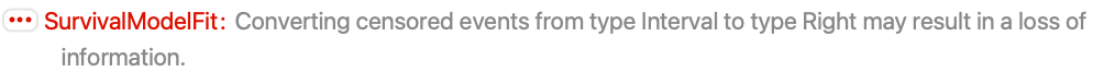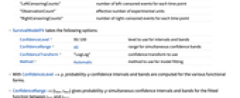 "AtRisk" number of individuals at risk at each time point "EventCounts" number of events for each time point "LeftCensoringCounts" number of left-censored events for each time point "ObservationCount" effective number of experimental units "RightCensoringCounts" number of right-censored events for each time point - SurvivalModelFit takes the following options: