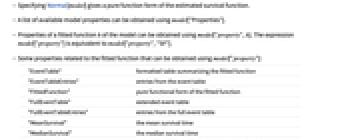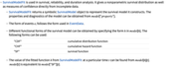 - SurvivalModelFit returns a symbolic SurvivalModel object to represent the survival model it constructs. The properties and diagnostics of the model can be obtained from model["property"].