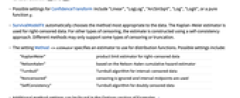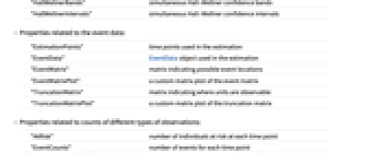 "PointwiseBands" pointwise confidence bands "PointwiseIntervals" pointwise confidence intervals "EqualPrecisionBands" simultaneous confidence bands "EqualPrecisionIntervals" simultaneous confidence intervals "HallWellnerBands" simultaneous Hall–Wellner confidence bands "HallWellnerIntervals" simultaneous Hall–Wellner confidence intervals - Properties related to the event data: