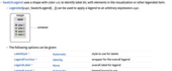 LabelStyle Automatic style to use for labels LegendFunction Identity wrapper for the overall legend LegendLabel None overall label for legend LegendLayout Automatic legend layout to use LegendMargins Automatic space between legend content and boundaries LegendMarkers Automatic markers to use to indicate each element LegendMarkerSize Automatic size of the shape - SwatchLegend is displayed in StandardForm as a table. In InputForm it is displayed as an explicit list of colors and labels.