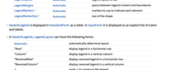 Automatic automatically determine layout "Row" display legend in a horizontal row "Column" display legend in a vertical column "ReversedRow" display reversed legend in a horizontal row "ReversedColumn" display reversed legend in a vertical column f apply f to construct the legend - The layout specification f is applied to the table of values {{col1,lbl1},…} to generate the legend.