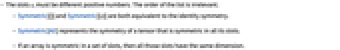 - Symmetric[{}] and Symmetric[{s}] are both equivalent to the identity symmetry.