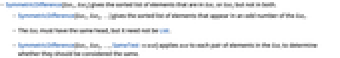 - SymmetricDifference[list1,list2,…] gives the sorted list of elements that appear in an odd number of the listi.