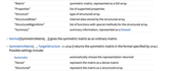 "Matrix" symmetric matrix, represented as a full array "Properties" list of supported properties "Structure" type of structured array "StructuredData" internal data stored by the structured array "StructuredAlgorithms" list of functions with special methods for the structured array "Summary" summary information, represented as a Dataset - Normal[SymmetricMatrix[…]] gives the symmetric matrix as an ordinary matrix.