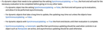 - For dynamic objects that take a long time to update, the updating may time out unless the objects have SynchronousUpdating->False.
