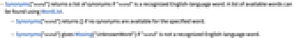 - Synonyms["word"] returns {} if no synonyms are available for the specified word.