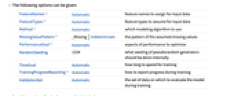 FeatureNames Automatic feature names to assign for input data FeatureTypes Automatic feature types to assume for input data Method Automatic which modeling algorithm to use MissingValuePattern _Missing|Indeterminate the pattern of the assumed missing values PerformanceGoal Automatic aspects of performance to optimize RandomSeeding 1234 what seeding of pseudorandom generators should be done internally TimeGoal Automatic how long to spend for training TrainingProgressReporting Automatic how to report progress during training ValidationSet Automatic the set of data on which to evaluate the model during training - Possible settings for PerformanceGoal include: