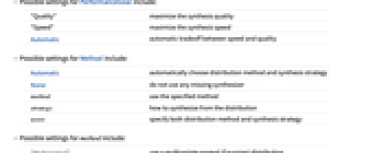 Automatic automatically choose distribution method and synthesis strategy None do not use any missing synthesizer method use the specified method strategy how to synthesize from the distribution assoc specify both distribution method and synthesis strategy - Possible settings for method include: