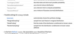 Automatic automatically choose the synthesis strategy "MarginalSampling" sample from each feature's marginal distribution "ModeFinding" find the mode of the distribution conditioned on known values "RandomSampling" sample from the distribution conditioned on known values (default) - In the form Methodassoc, the association assoc should be of the form <|"LearningMethod"method,"EvaluationStrategy"strategy|>.