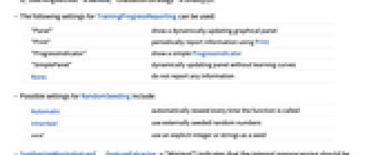"Panel" show a dynamically updating graphical panel "Print" periodically report information using Print "ProgressIndicator" show a simple ProgressIndicator "SimplePanel" dynamically updating panel without learning curves None do not report any information - Possible settings for RandomSeeding include: