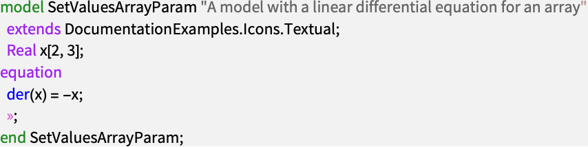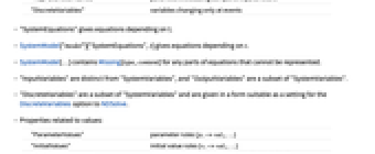 "SystemEquations" differential and algebraic equations "InitialEquations" initial value equations "InitialSeedings" guess values for initialization "StateVariables" differentiated variables "AlgebraicVariables" non-differentiated variables "SystemVariables" state and algebraic variables "TopSystemVariables" system variables excluding component variables "InputVariables" variables specified as inputs "OutputVariables" variables specified as outputs "ParameterNames" parameters "TopParameterNames" parameters excluding component parameters "DiscreteVariables" variables changing only at events - "SystemEquations" gives equations depending on t.