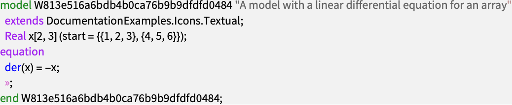 "Description" top-level description of model "Summary" model summary data "ModelName" fully qualified path of model "Diagram" diagram view of model "ModelicaIcon" icon view of model "ModelicaDisplay" show Modelica model code "ModelicaString" Modelica model code as a string "SourceFile" file where the model is saved "Documentation" open model documentation "DocumentationURL" link to model documentation "Domain" association describing modeling domain "DomainChart" chart describing modeling domain "Balanced" if the model is balanced in equations and variables "SimulationModel" if the model is a simulation model "Specialization" specialization "model", "package", "function", … "Version" version information of model "SimulationSettings" model simulation options - "ModelicaDisplay" creates a cell with style "Program" containing the textual form of "model".