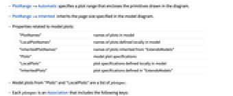 "PlotNames" names of plots in model "LocalPlotNames" names of plots defined locally in model "InheritedPlotNames" names of plots inherited from "ExtendsModels" "Plots" model plot specifications "LocalPlots" plot specifications defined locally in model "InheritedPlots" plot specifications defined in "ExtendsModels" - Model plots from "Plots" and "LocalPlots" are a list of plotspec.