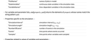 "SimulationInterval" simulation interval {tmin,tmax} "SimulationLength" simulation length tmax-tmin "NumberOfEvents" number of events in the simulation "Events" time points where events occurred "Samples" time points when variables were sampled - Properties related to values of variables and parameters: »