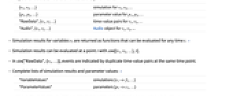 "VariableValues" simulations {v1->f1,…} "ParameterValues" parameters {p1->c1,…} - Lists of simulation results from sim can be evaluated at a point t with sim["VariableValues",t].