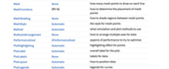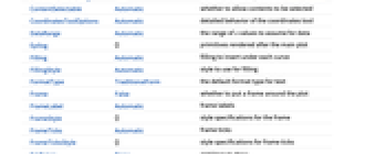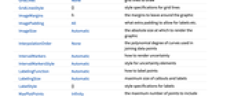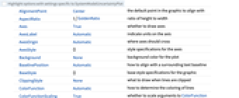 AlignmentPoint Center the default point in the graphic to align with AspectRatio 1/GoldenRatio ratio of height to width Axes True whether to draw axes AxesLabel Automatic indicate units on the axis AxesOrigin Automatic where axes should cross AxesStyle {} style specifications for the axes Background None background color for the plot BaselinePosition Automatic how to align with a surrounding text baseline BaseStyle {} base style specifications for the graphic ClippingStyle None what to draw when lines are clipped ColorFunction Automatic how to determine the coloring of lines ColorFunctionScaling True whether to scale arguments to ColorFunction ContentSelectable Automatic whether to allow contents to be selected CoordinatesToolOptions Automatic detailed behavior of the coordinates tool DataRange Automatic the range of x values to assume for data Epilog {} primitives rendered after the main plot Filling Automatic filling to insert under each curve FillingStyle Automatic style to use for filling FormatType TraditionalForm the default format type for text Frame False whether to put a frame around the plot FrameLabel Automatic frame labels FrameStyle {} style specifications for the frame FrameTicks Automatic frame ticks FrameTicksStyle {} style specifications for frame ticks GridLines None grid lines to draw GridLinesStyle {} style specifications for grid lines ImageMargins 0. the margins to leave around the graphic ImagePadding All what extra padding to allow for labels etc. ImageSize Automatic the absolute size at which to render the graphic InterpolationOrder None the polynomial degree of curves used in joining data points IntervalMarkers Automatic how to render uncertainty IntervalMarkersStyle Automatic style for uncertainty elements LabelingFunction Automatic how to label points LabelingSize Automatic maximum size of callouts and labels LabelStyle {} style specifications for labels MaxPlotPoints Infinity the maximum number of points to include Mesh None how many mesh points to draw on each line MeshFunctions {#1&} how to determine the placement of mesh points MeshShading None how to shade regions between mesh points MeshStyle Automatic the style for mesh points Method Automatic what simulation and plot methods to use MultiaxisArrangement None how to arrange multiple axes for data PerformanceGoal $PerformanceGoal aspects of performance to try to optimize PlotHighlighting Automatic highlighting effect for points PlotLabel Automatic overall label for the plot PlotLabels None labels for data PlotLayout Automatic how to position data PlotLegends Automatic legends for curves PlotMarkers None markers to use to indicate each point PlotRange Automatic range of values to include PlotRangeClipping True whether to clip at the plot range PlotRangePadding Automatic how much to pad the range of values PlotRegion Automatic the final display region to be filled PlotStyle Automatic graphics directives to determine the style of each line PlotTheme $PlotTheme overall theme for the plot PreserveImageOptions Automatic whether to preserve image options when displaying new versions of the same graphic ProgressReporting $ProgressReporting control display of progress Prolog {} primitives rendered before the main plot RotateLabel True whether to rotate y labels on the frame SamplingPeriod Automatic sample period for random processes ScalingFunctions None how to scale individual coordinates TargetUnits Automatic - units to display in the plot