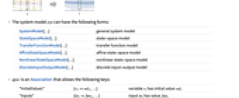 SystemModel[…] general system model StateSpaceModel[…] state-space model TransferFunctionModel[…] transfer function model AffineStateSpaceModel[…] affine state-space model NonlinearStateSpaceModel[…] nonlinear state-space model DiscreteInputOutputModel[…] discrete input-output model - spec is an Association that allows the following keys: