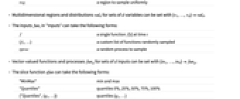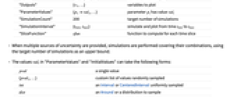 "InitialValues" {v1val1,…} variable vi has initial value vali "Inputs" {in1fun1,…} input ini has value funi "Outputs" {v1,…} variables to plot "ParameterValues" {p1val1,…} parameter pi has value vali "SimulationCount" 200 target number of simulations "SimulationInterval" {tmin,tmax} simulate and plot from time tmin to tmax "SliceFunction" sfun function to compute for each time slice - When multiple sources of uncertainty are provided, simulations are performed covering their combinations, using the target number of simulations as an upper bound.