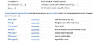 "MinMax" min and max "Quantiles" quantiles 0%, 25%, 50%, 75%, 100% {"Quantiles",{q1,…}} quantiles {q1,…} "Confidence" mean and 95% confidence bands {"Confidence",{cl1,…}} confidence bands with confidence levels {cl1,…} {sfun1,…} list of custom scalar-valued functions - SystemModelUncertaintyPlot has the same options as ListLinePlot, with the following additions and changes: [List of all options]