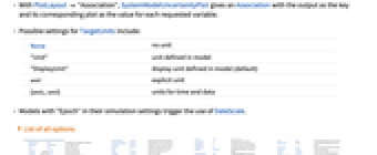 AxesLabel Automatic indicate units on the axis Filling Automatic filling to insert under each curve FrameLabel Automatic frame labels Method Automatic what simulation and plot methods to use PlotLabel Automatic overall label for the plot PlotLayout Automatic how to position data PlotLegends Automatic legends for curves ProgressReporting $ProgressReporting control display of progress SamplingPeriod Automatic sample period for random processes TargetUnits Automatic - units to display in the plot
