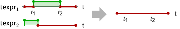 is True in the intervals where texpr1 is True until texpr2 first becomes True.