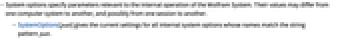 - SystemOptions[patt] gives the current settings for all internal system options whose names match the string pattern patt.