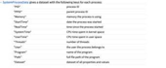 "PID" process ID "PPID" parent process ID "Memory" memory the process is using "StartTime" date the process was started "RealTime" time since the process started "SystemTime" CPU time spent in kernel space "UserTime" CPU time spent in user space "Threads" number of threads "User" the user the process belongs to "Program" name of the program "Path" full file path of the program "Dataset" dataset of all properties and values - In the dataset returned by SystemProcessData, processes are sorted by PID.