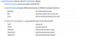 Windows all unelevated processes Mac processes only for the current user Linux all non-kernel processes for all users - In SystemProcesses[prop->val], properties that can be used include: