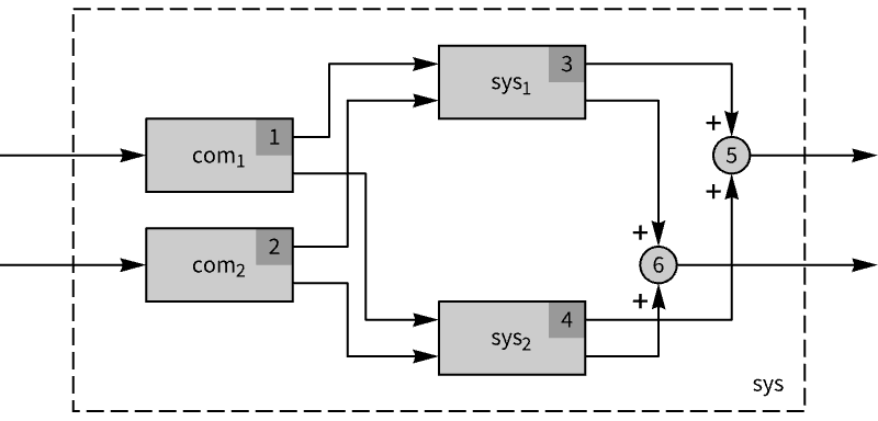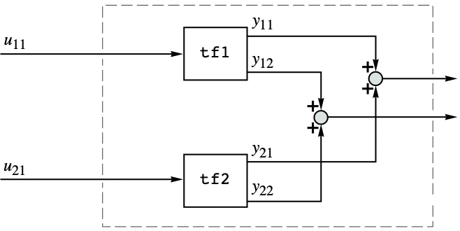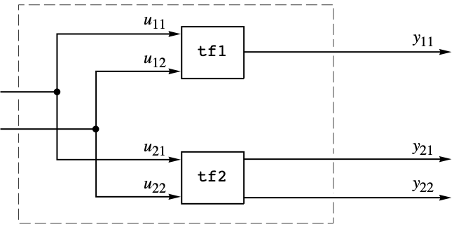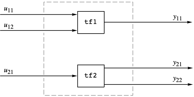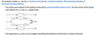 - The inputs and outputs of the system produced by SystemsModelParallelConnect are the unions of the inputs and outputs of sys1 and sys2, respectively.