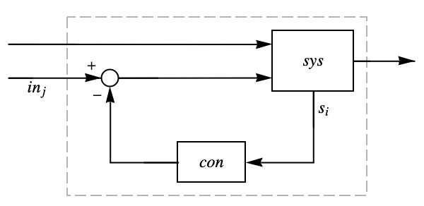connects the states of the systems model sys to the controller con and the outputs of con to the inputs of sys in feedback.