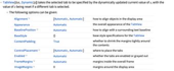 Alignment {Automatic,Automatic} how to align objects in the display area Appearance Automatic the overall appearance of the TabView BaselinePosition Automatic how to align with a surrounding text baseline BaseStyle {} base style specifications for the TabView ContentPadding True whether to shrink the margins tightly around the contents ControlPlacement {Automatic,Automatic} where to place the tabs Enabled Automatic whether the tabs are enabled or grayed out FrameMargins Automatic margins inside the overall frame ImageMargins 0 margins around the display area ImageSize All the overall image size for the display area LabelStyle {} style specifications for the tab area - With the default option setting ImageSize->All, TabView always leaves space for the largest of the expri to be displayed, so that its overall size does not change. »