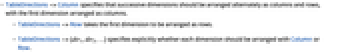 - TableDirections->Column specifies that successive dimensions should be arranged alternately as columns and rows, with the first dimension arranged as columns.