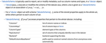 - TabularSchema is typically used to report, set or modify metadata, such as column names and types, in a Tabular object.