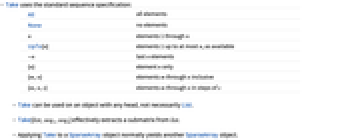 All all elements None no elements n elements 1 through n UpTo[n] elements 1 up to at most n, as available -n last n elements {n} element n only {m,n} elements m through n inclusive {m,n,s} elements m through n in steps of s - Take can be used on an object with any head, not necessarily List.