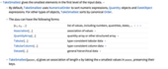 {e1,e2,…} list of values, including numbers, quantities, dates, ... » » » Association[…] association of values » QuantityArray[…] quantity array or other structured array » Tabular[…] type-consistent tabular data » TabularColumn[…] type-consistent column data » Dataset[…] general hierarchical data » - TakeSmallest[assoc,n] gives an association of length n by taking the n smallest values in assoc, preserving their keys.