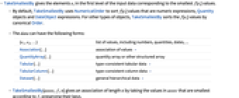 {e1,e2,…} list of values, including numbers, quantities, dates, ... Association[…] association of values » QuantityArray[…] quantity array or other structured array Tabular[…] type-consistent tabular data » TabularColumn[…] type-consistent column data » Dataset[…] general hierarchical data » - TakeSmallestBy[assoc,f,n] gives an association of length n by taking the values in assoc that are smallest according to f, preserving their keys.