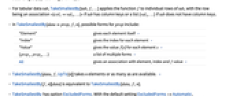 - For tabular data tab, TakeSmallestBy[tab,f,…] applies the function f to individual rows of tab, with the row being an association <|col1val1,…|> if tab has column keys or a list {val1,…} if tab does not have column keys.