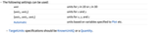 unit units for y in 2D or z in 3D {unitx,unity} units for x and y {unitx,unity,unitz} units for x, y, and z Automatic units based on variables specified to Plot etc. - TargetUnits specifications should be KnownUnitQ or a Quantity.